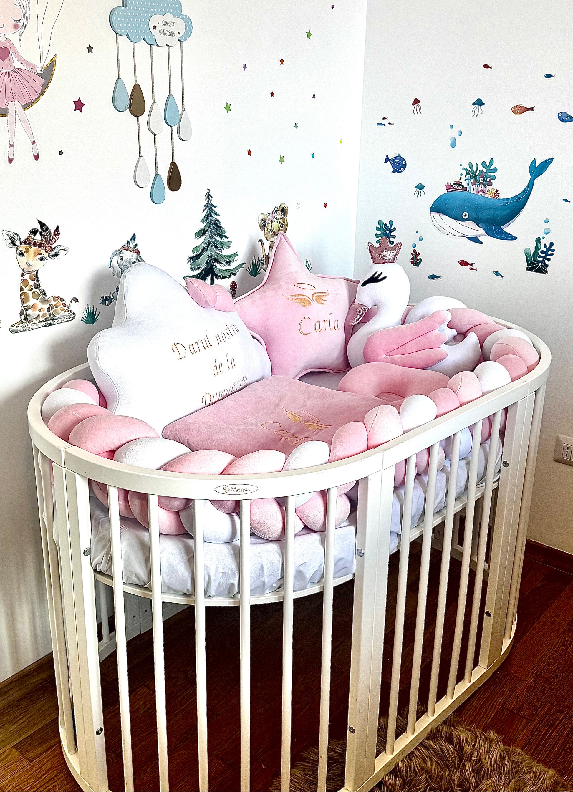 Creează un spațiu de poveste pentru micuțul tău cu acest set premium de accesorii pentru pătuț, realizat din materiale sigure și delicate pentru pielea sensibilă a bebelușului.