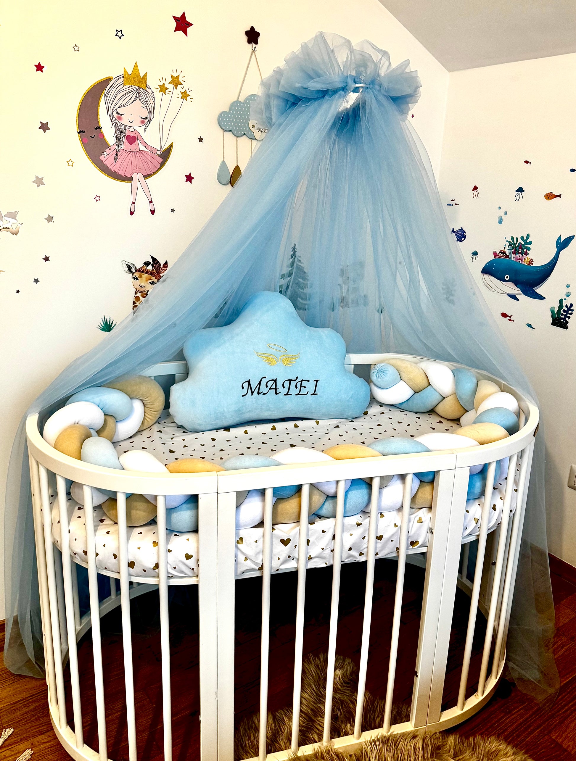Set de accesorii pentru pătuțul bebelușului cu protecție împletită, pernuță personalizată și baldachin. Albastru, alb, bej.