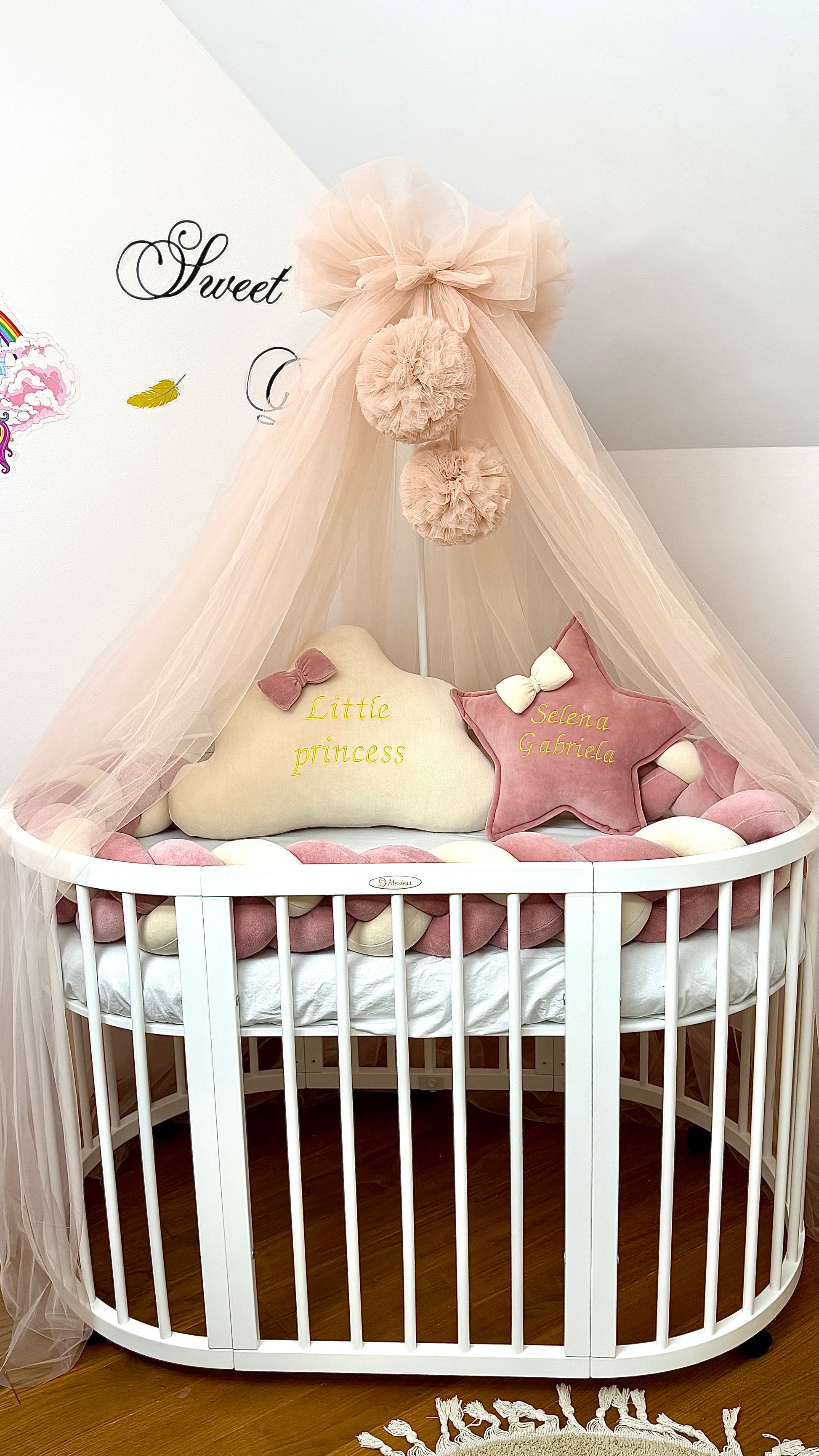 Set premium accesorii pentru pătuțul bebelușului – Protecție împletită, pernuțe personalizate, baldachin cu suport și cearceaf oval