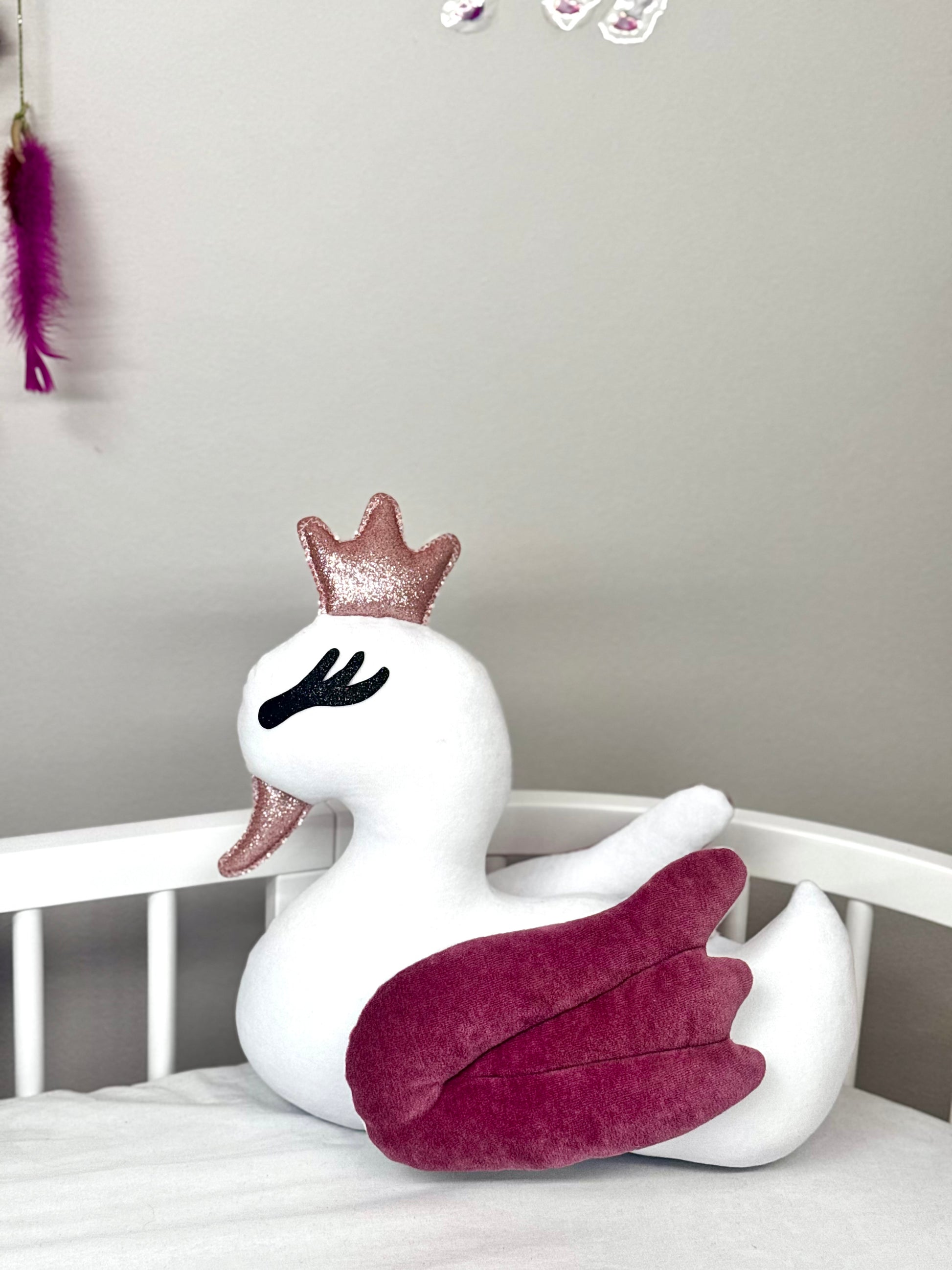 Lebădă decorativă din velur moale cu umplutură hipoalergenică – decor pentru camera copilului. ROZ TRANDAFIRIU