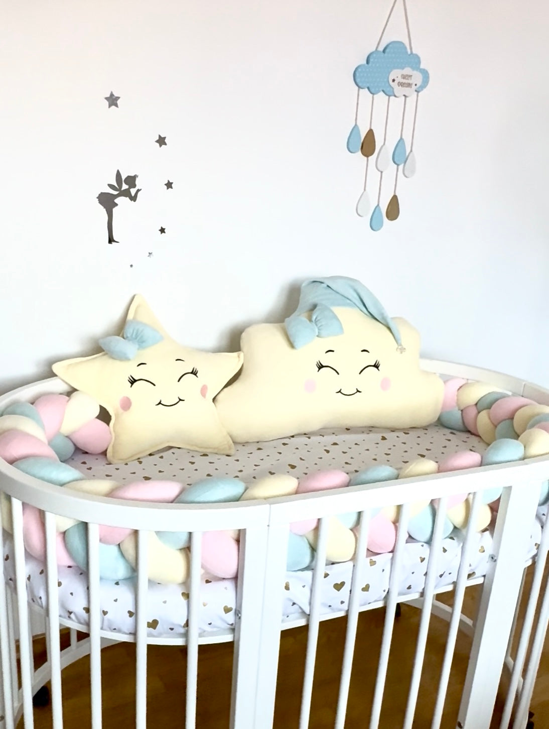 Set Accesorii Pătuț Bebeluș – Protecție Împletită 230 cm, Pernuță Norișor și Pernuță Stea